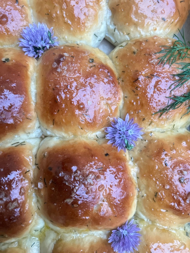 Since I have Dill and Chives growing in my garden this year, I couldn’t wait to create to a recipe to utilize two of my favorite summer herbs. This recipe starts with a method called a Tangzhong, a Tangzhong is a paste of flour cooked in water or milk and improves the texture of bread. Its very easy and wonderful addition to any yeasted bread recipe. I hope you enjoy these soft fluffy rolls!